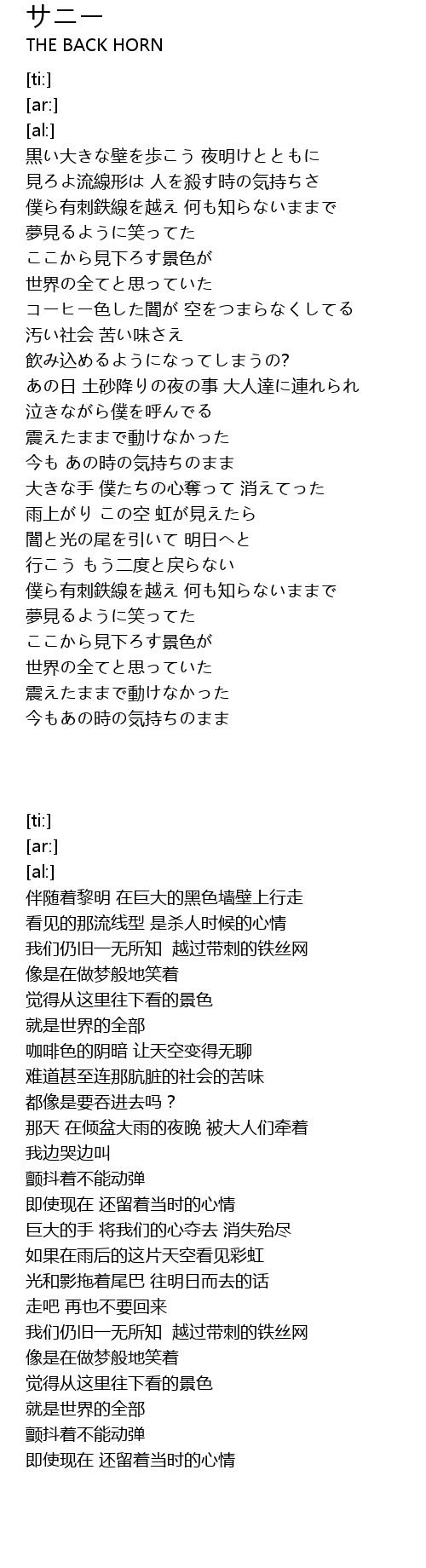 | [00:42.44] | 僕ら有刺鉄線を越え 何も知らないままで |