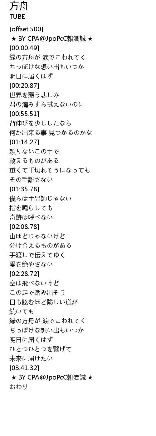 | [00:01.11] | 緑の方舟が 涙でこわれてく |