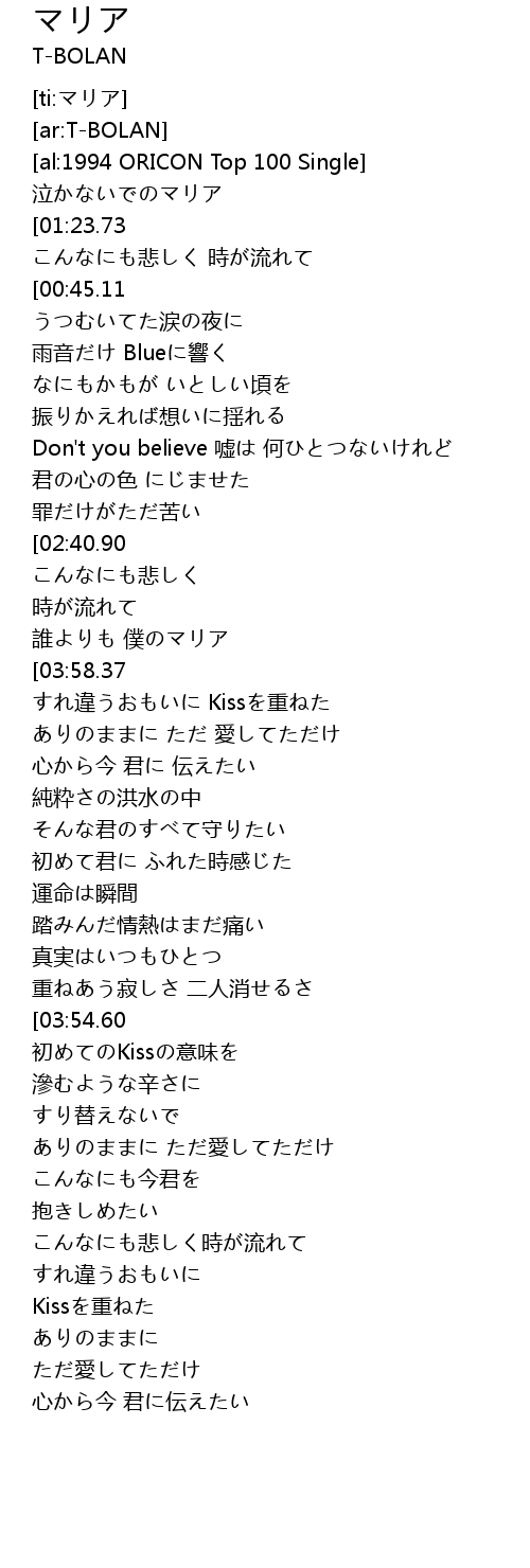 | [01:19.58][02:40.90][03:39.75] | 泣かないで僕のマリア |
