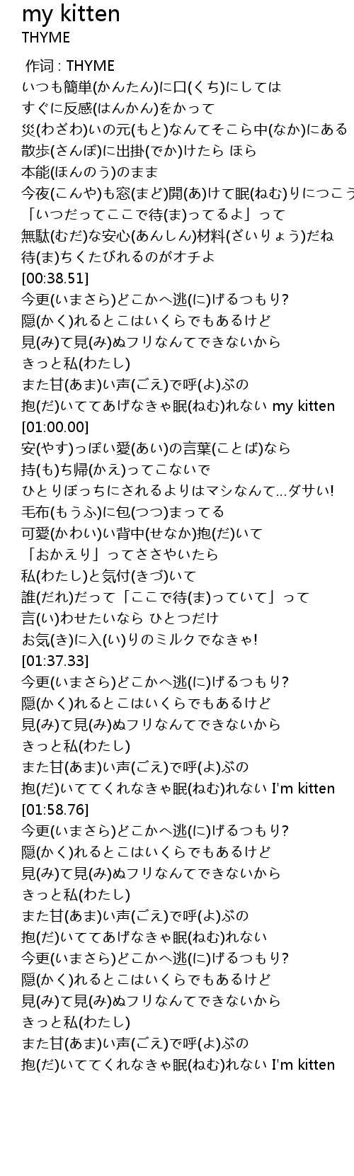 | [00:56.34] | 抱(だ)いててあげなきゃ眠(ねむ)れない my kitten |