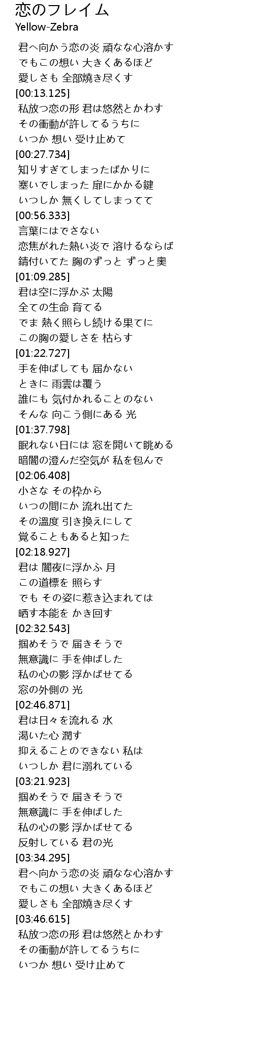 | [03:34.623] | 君へ向かう恋の炎 頑なな心溶かす |