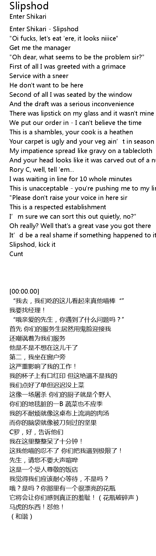 | [00:07.53] | " Oi fucks, let' s eat ' ere, it looks niiice" |