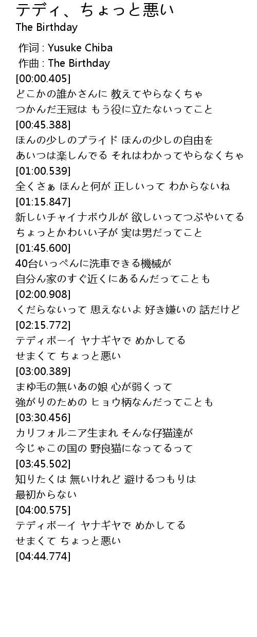 | [02:49.888] | テディボーイ ヤナギヤで めかしてる |