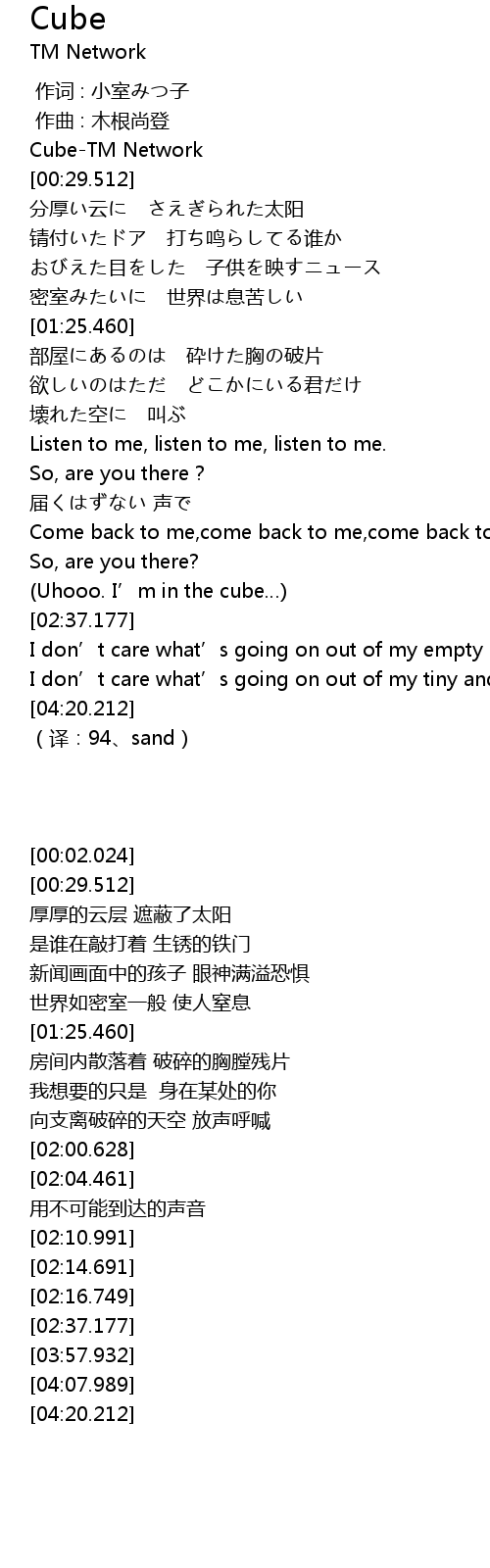 | [04:07.989] | I don' t care what' s going on out of my tiny and empty cube |