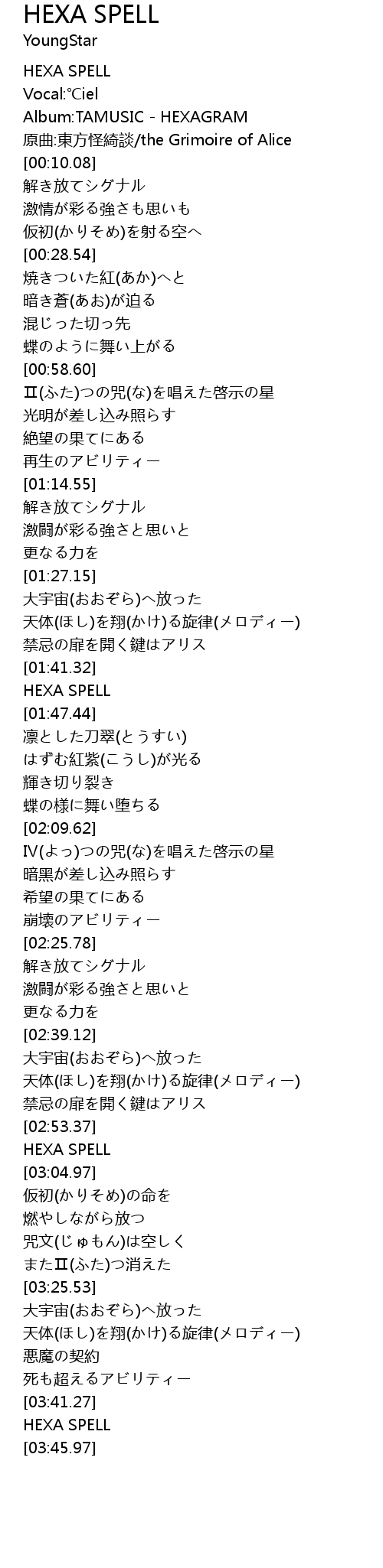 | [00:58.87] | Ⅱ(ふた)つの咒(な)を唱えた啓示の星 |