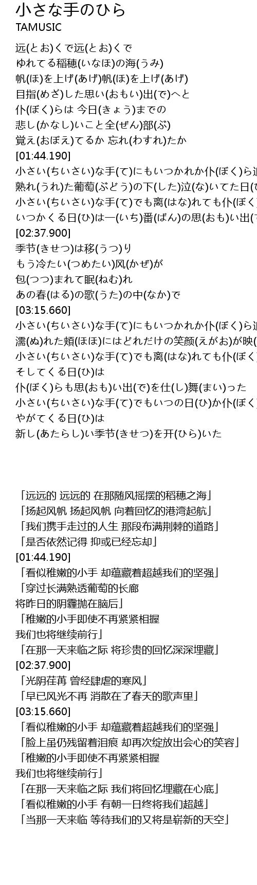| [03:16.420] | 小さい(ちいさい)な手(て)にもいつかれか仆(ぼく)ら追(お)い越(こ)してく强(つよ)さ |