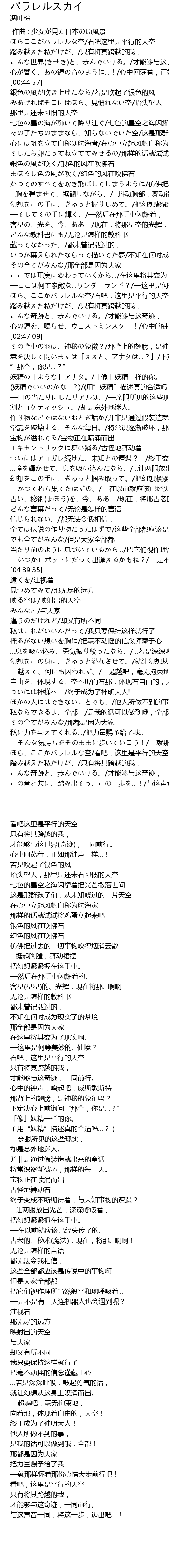 | [02:25.06] | ほら、ここがパラレルな空/看吧,这里是平行的天空 |