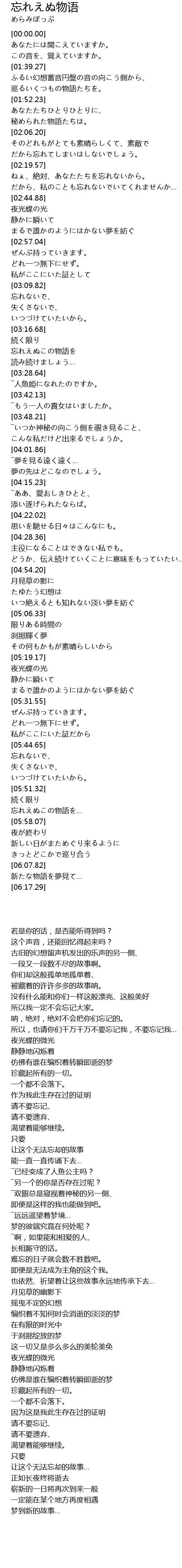 | [01:45.91] | 巡るいくつもの物語たちを。 |