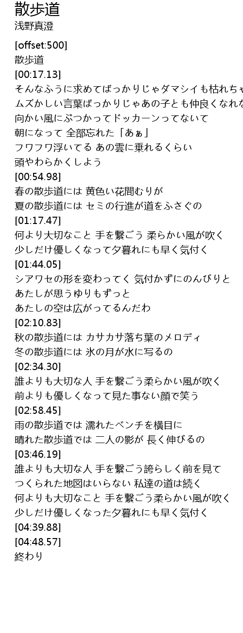 | [03:31.39] | 晴れた散歩道では 二人の影が 長く伸びるの |