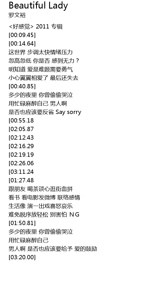 | [02:46.76][02:05.87][00:55.85] | Beautiful lady 要懂得爱自己 |