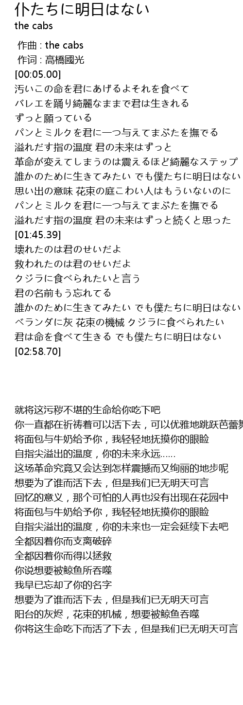 | [02:46.81] | 君は命を食べて生きる でも僕たちに明日はない |