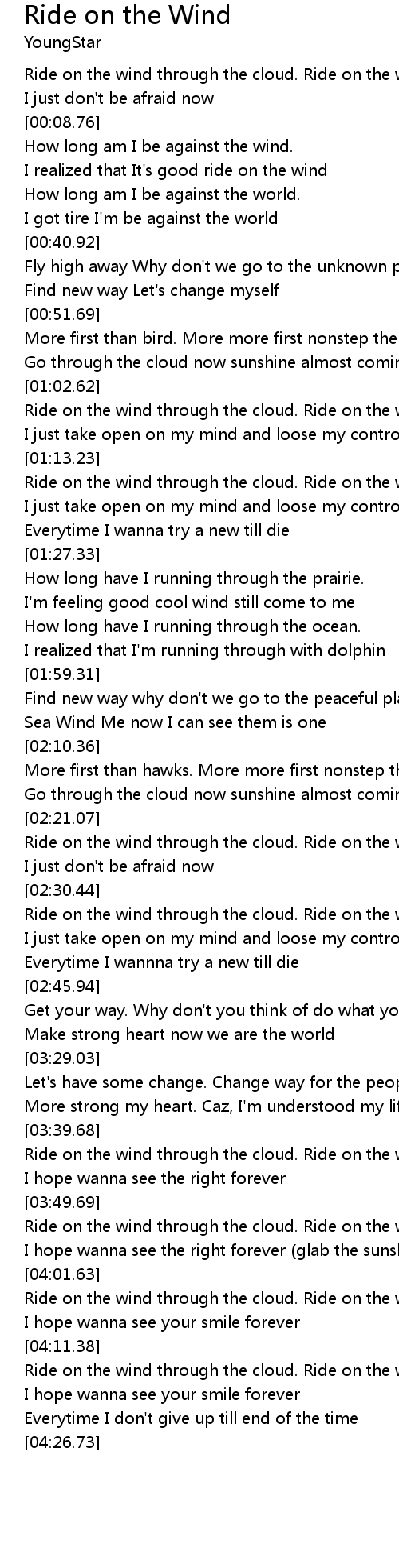 | [04:01.93] | Ride on the wind through the cloud. Ride on the wind through the cloud |
