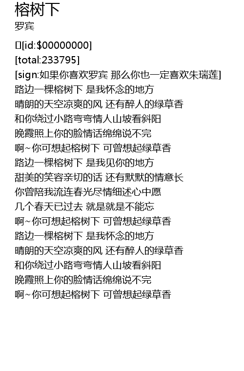 | [00:32.234] | 路边一棵榕树下 是我怀念的地方 |