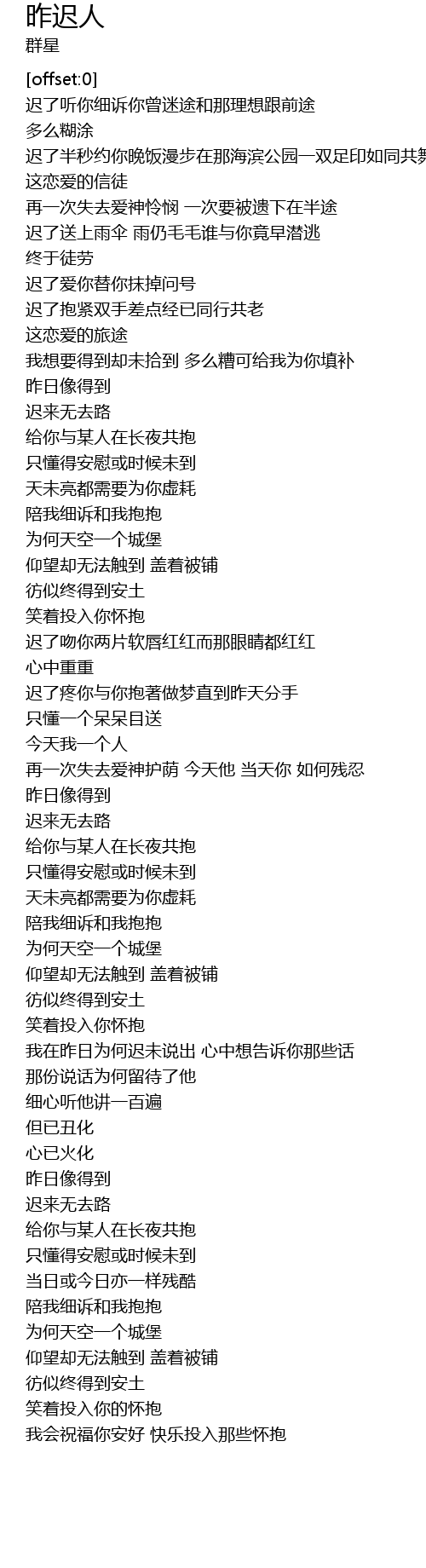 | [02:01.81] | 迟了爱你替你抹掉问号 迟了抱紧双手差点经已同行共老 |