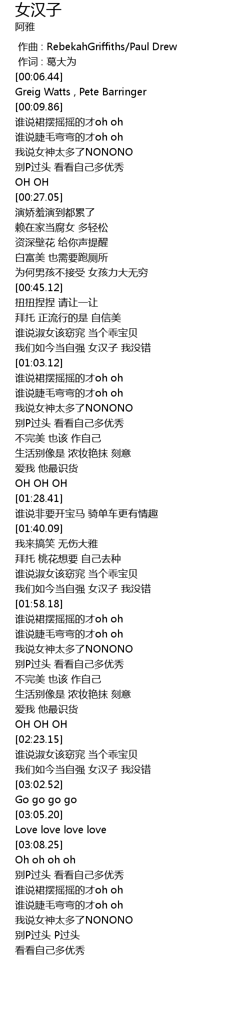 | [00:56.94] | 我们如今当自强 女汉子 我没错 |