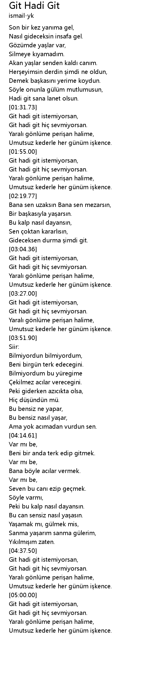 | [03:34.44] | Git hadi git hi sevmiyorsan. |