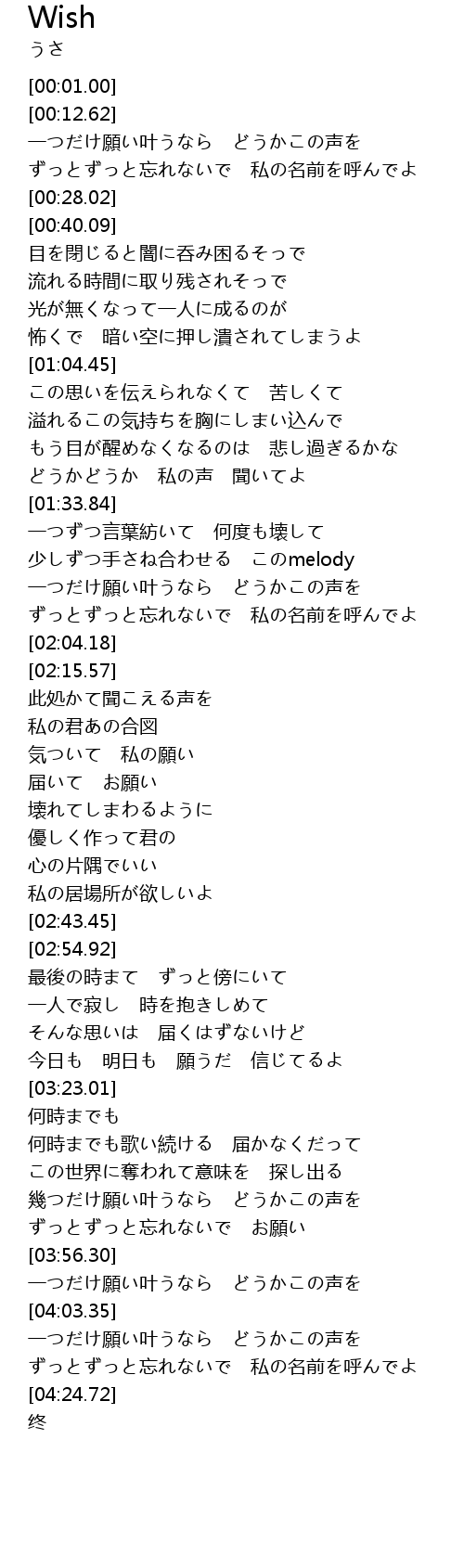 | [03:56.79] | 一つだけ願い叶うなら どうかこの声を |