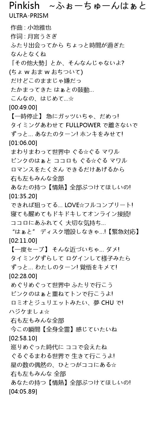 | [02:35.63] | ピンクのはぁと重ねてトンで行こうよ! |