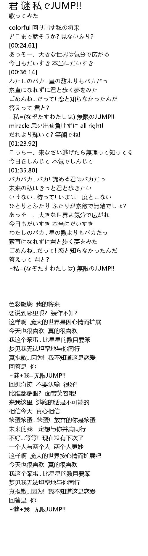 | [02:45.06] | +私=(なぞたすわたしは) 無限のJUMP!! |