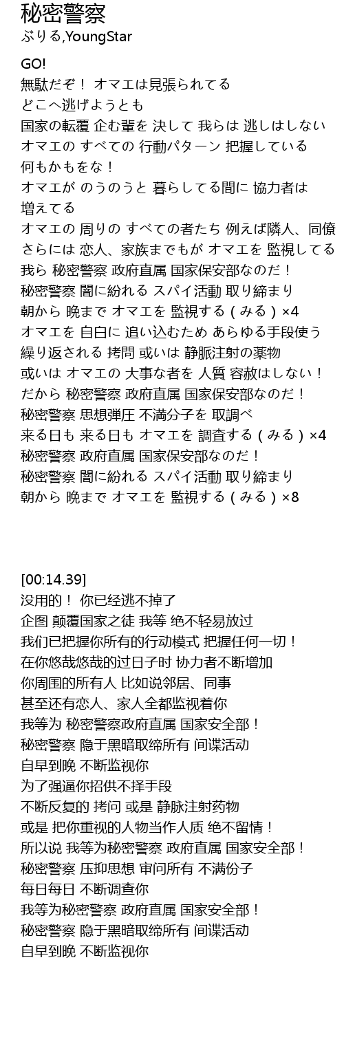 | [00:53.29] | 我ら 秘密警察 政府直属 国家保安部なのだ! |