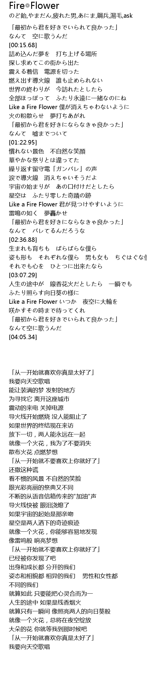 | [00:59.62] | Like a Fire Flower 僕が消えちゃわないように |