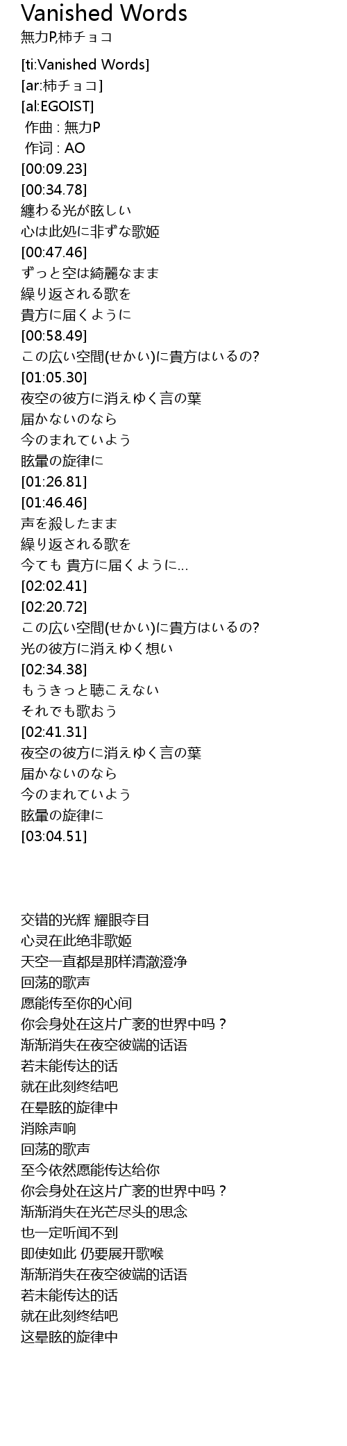 | [02:41.61] | 夜空の彼方に消えゆく言の葉 |