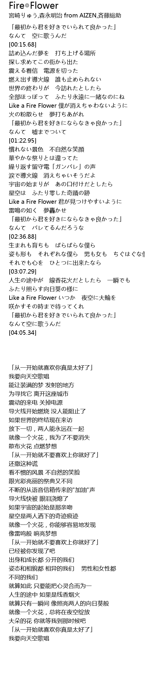 | [00:59.62] | Like a Fire Flower 僕が消えちゃわないように |