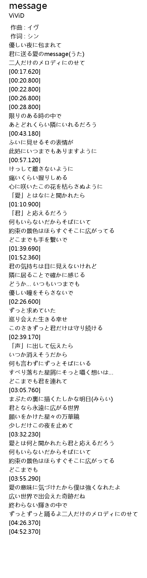 | [00:04.360] | 君に送る愛のmessage(うた) |