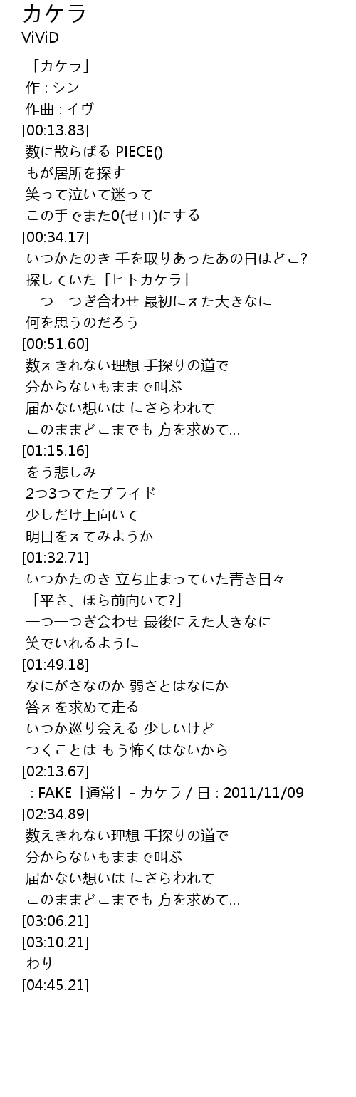 | [02:20.89] | ∶FAKE「通常」- カケラ/日∶2011/11/09 |