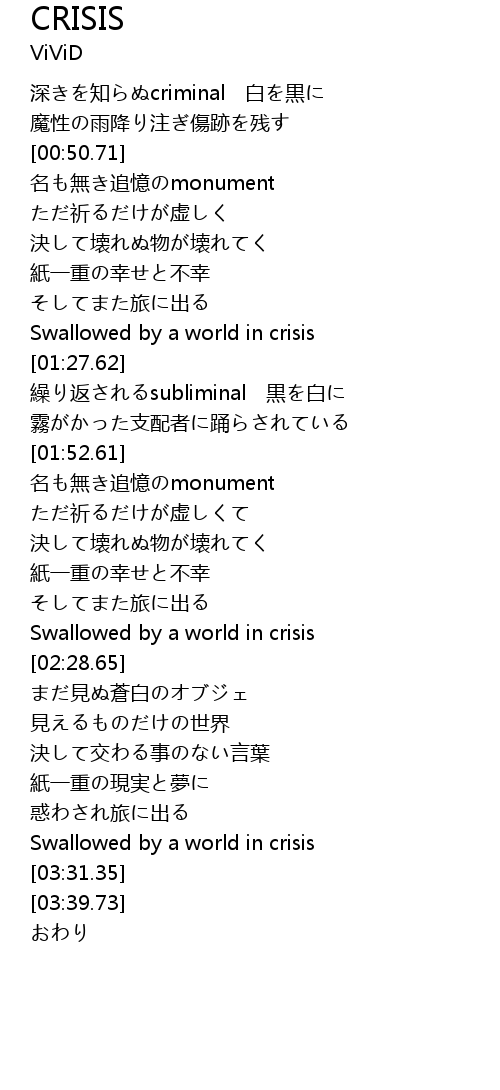 | [01:18.83] | Swallowed by a world in crisis |