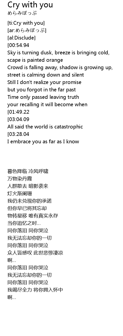 | [01:35.58][01:49.22][02:57.27][03:10.90] | Cry with you, cry with you |