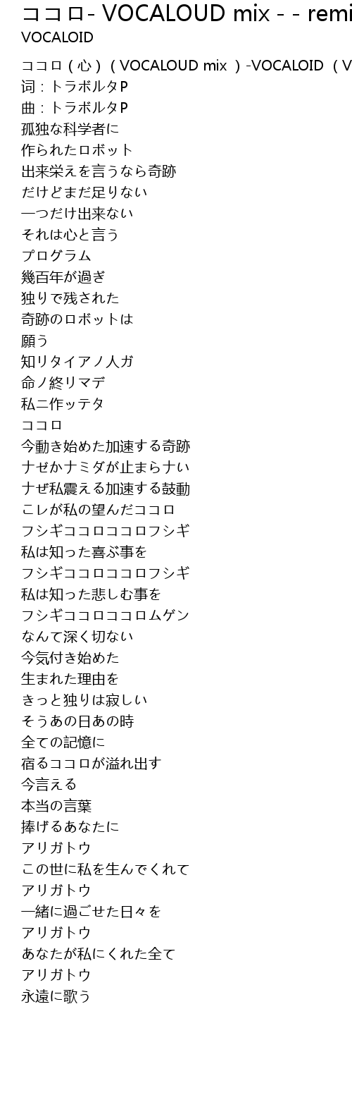 | [00:00.00] | ココロ(心)(VOCALOUD mix )-VOCALOID (VOCALOID 家族) |
