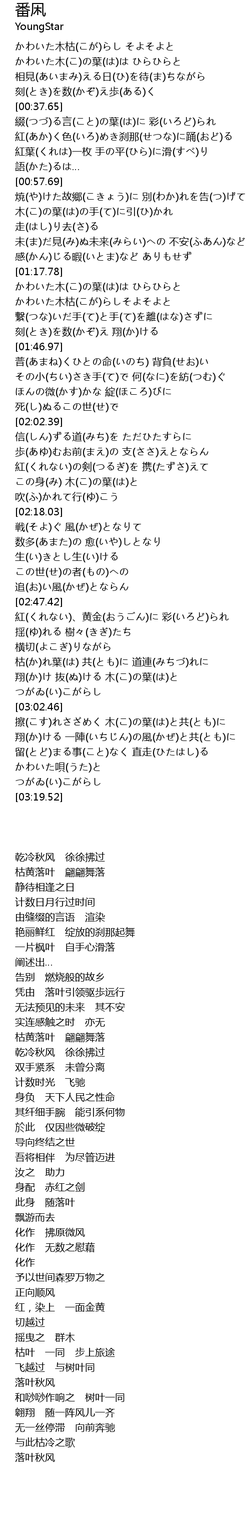 | [02:55.09] | 枯(か)れ葉(は) 共(とも)に 道連(みちづ)れに |