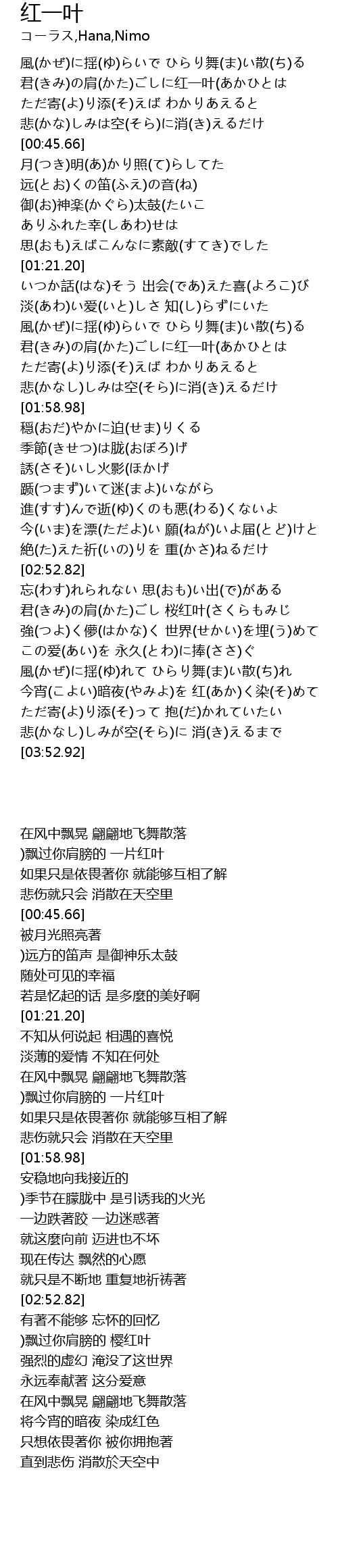 | [01:41.52] | 君(きみ)の肩(かた)ごしに红一叶(あかひとは |