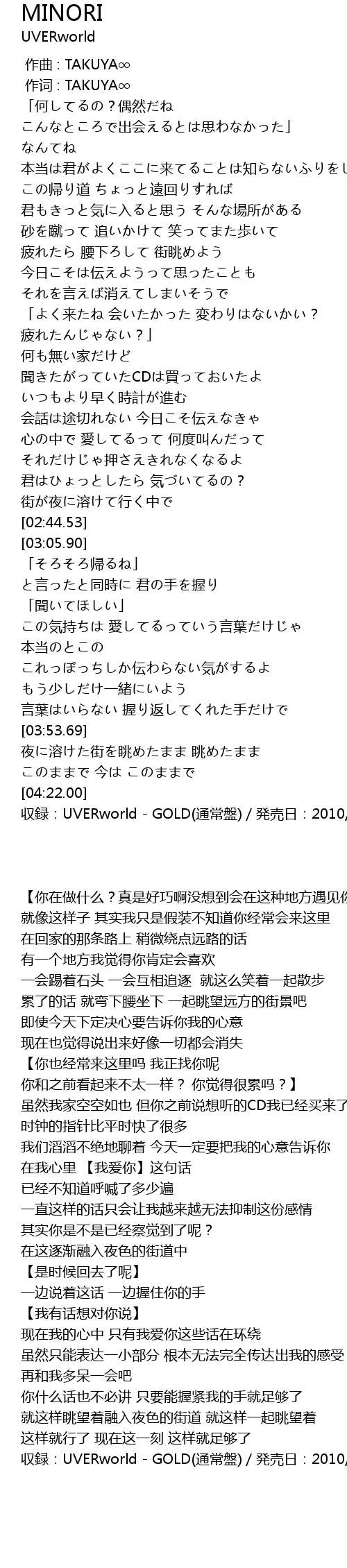 | [04:24.00] | 収録:UVERworld - GOLD(通常盤)/発売日:2010/03/31 |