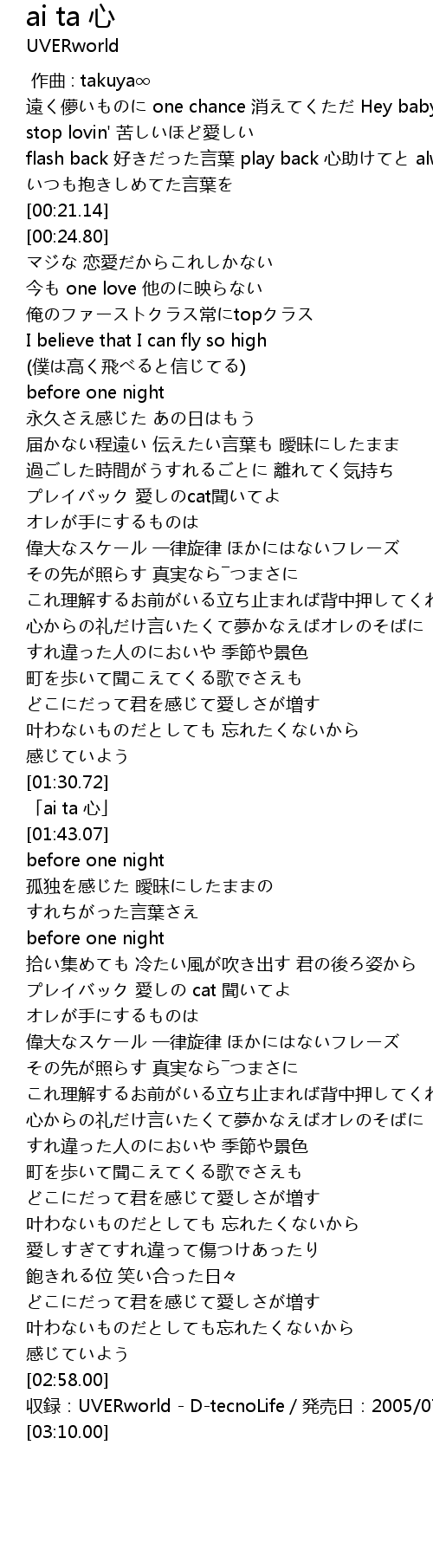 | [03:00.00] | 収録:UVERworld - D-tecnoLife/発売日:2005/07/06 |