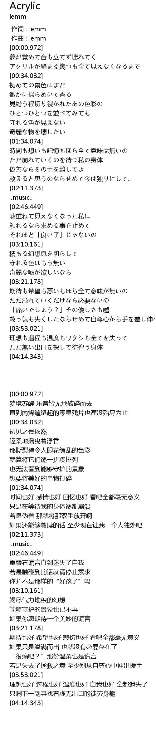 | [00:22.506] | アクリルが絡まる幾つも全て見えなくなるまで |