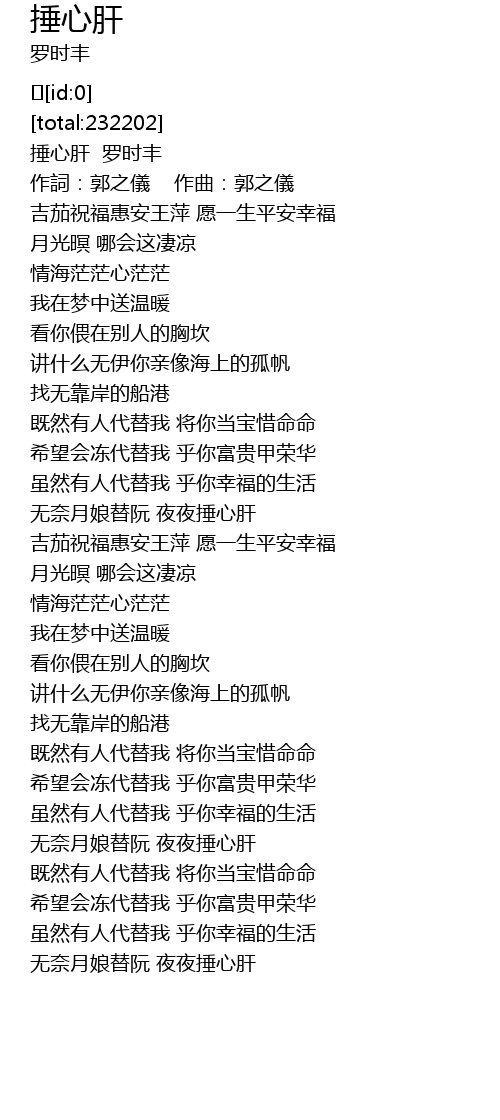 | [03:24.204] | 无奈月娘替阮 夜夜捶心肝 |