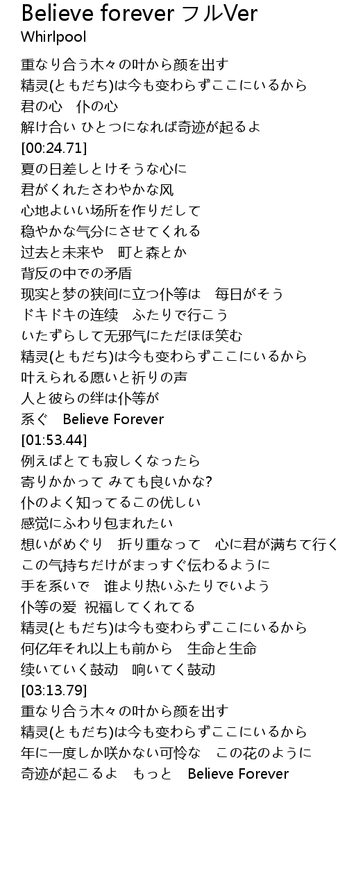 | [03:56.32] | 奇迹が起こるよ もっと Believe Forever |