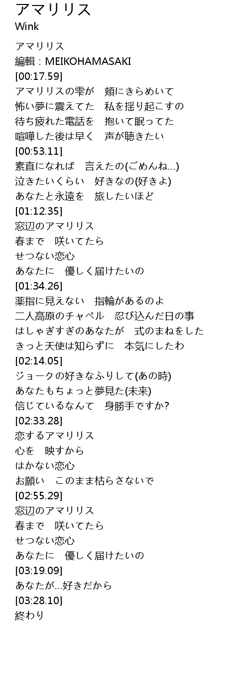| [00:19.98] | アマリリスの雫が 頬にきらめいて |
