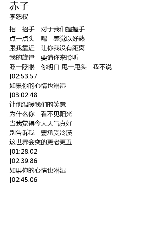 | [03:15.56][02:45.06][01:44.25] | bie wang chi zi de xin qing rang ta wen nuan wo men de xiao yi |