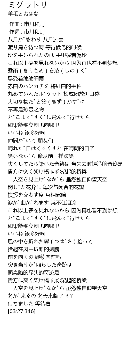 | [02:41.335] | 風の中を折れた翼(つばさ)拾って 拾起在风中折断的翅膀 |
