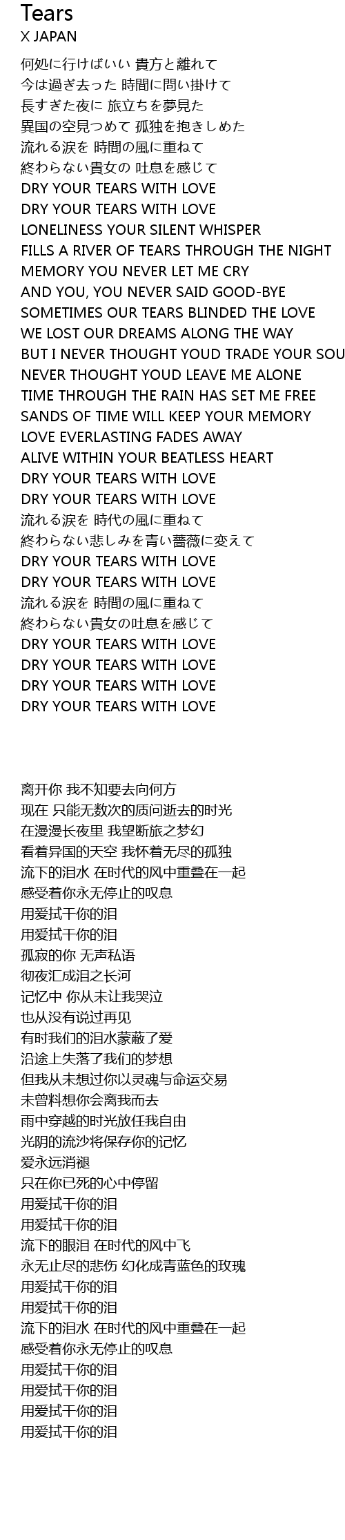 | [06:00.500] | DRY YOUR TEARS WITH LOVE |