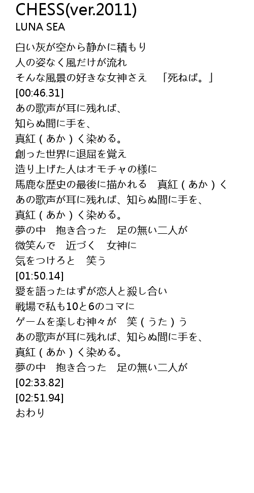 | [01:09.92] | 馬鹿な歴史の最後に描かれる 真紅(あか)く |