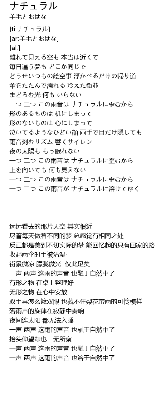 | [01:15.11] | 一つ 二つ この雨音は ナチュラルに歪むから |
