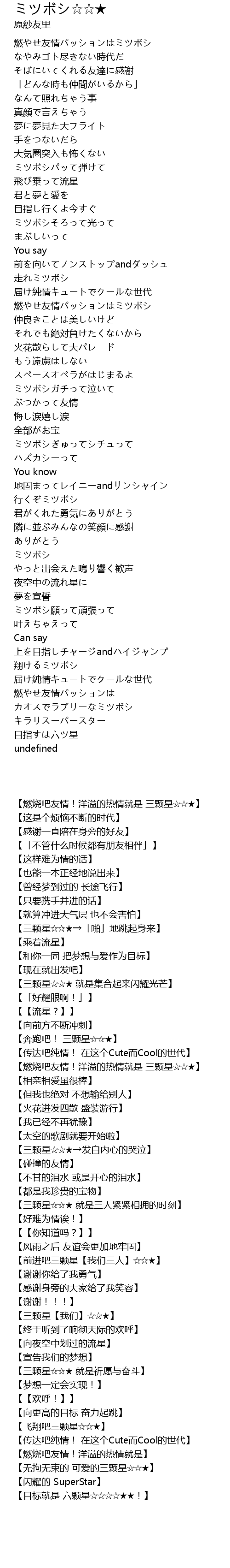 | [00:00.370] | 燃やせ友情パッションはミツボシ |