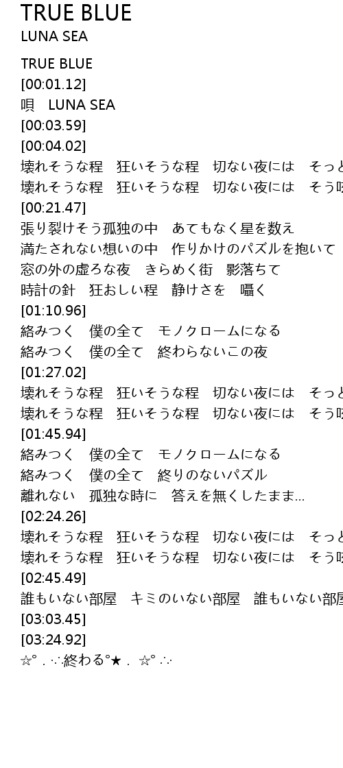 | [00:12.73] | 壊れそうな程 狂いそうな程 切ない夜には そう呟いた... |