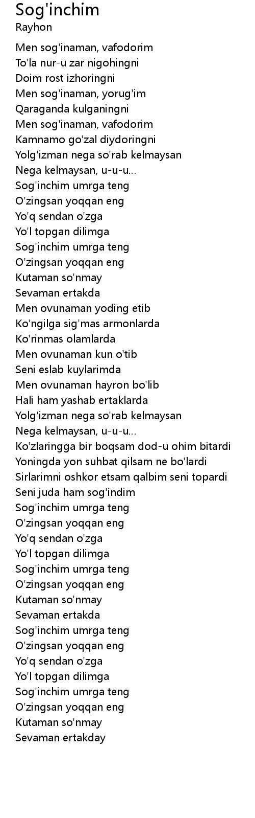 | [00:09.61] | Men sog'inaman, vafodorim |