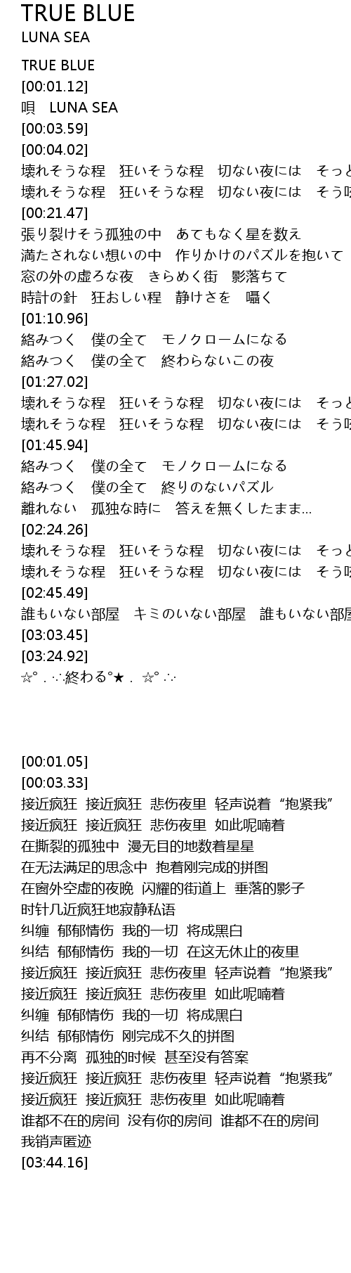 | [00:12.73] | 壊れそうな程 狂いそうな程 切ない夜には そう呟いた... |