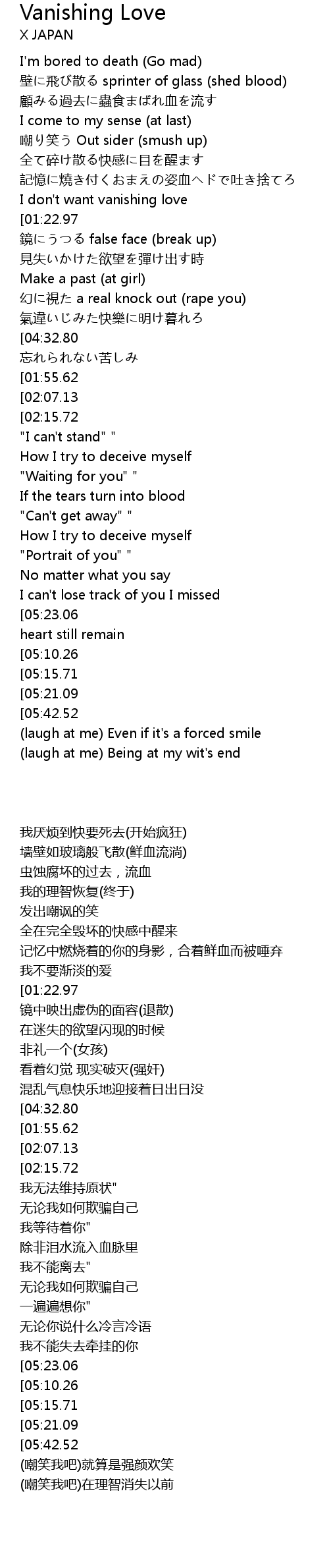 | [01:44.40][04:32.80][01:44.70] | ★ 絡みつくおまえの幻影 忘れられない苦しみ |